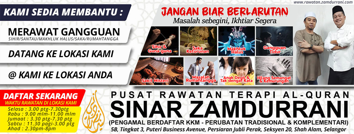 Selamat datang ke Sinar Zamdurrani, pusat rawatan berlandaskan kaedah perubatan Islam yang merangkumi ruqyah syar'iyyah, rawatan gangguan makhluk halus, terapi spiritual, dan kaunseling berasaskan al-Quran serta Sunnah. Kami sedia membantu anda dengan cara yang selari dengan syariat Islam, bagi merawat masalah gangguan rohani, jasmani, serta mental.